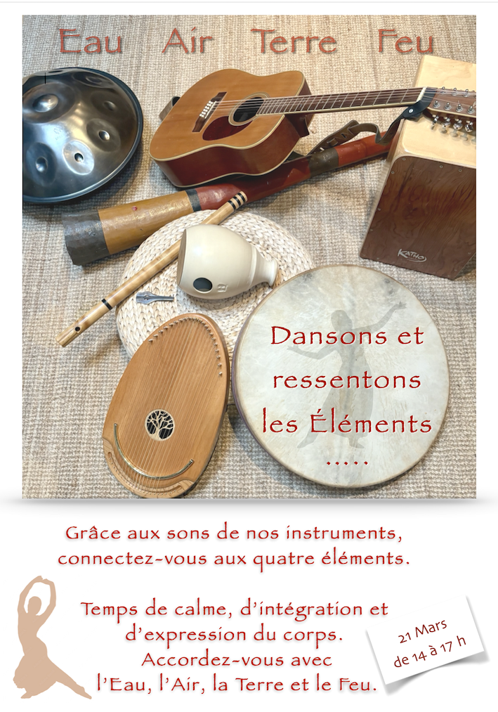 À chaque élément, un temps consacré à son accueil, son intégration, un autre à l’expression du corps, accompagné de vibrations sonores et musicale pour nous mettre en contact avec leur quintessence.